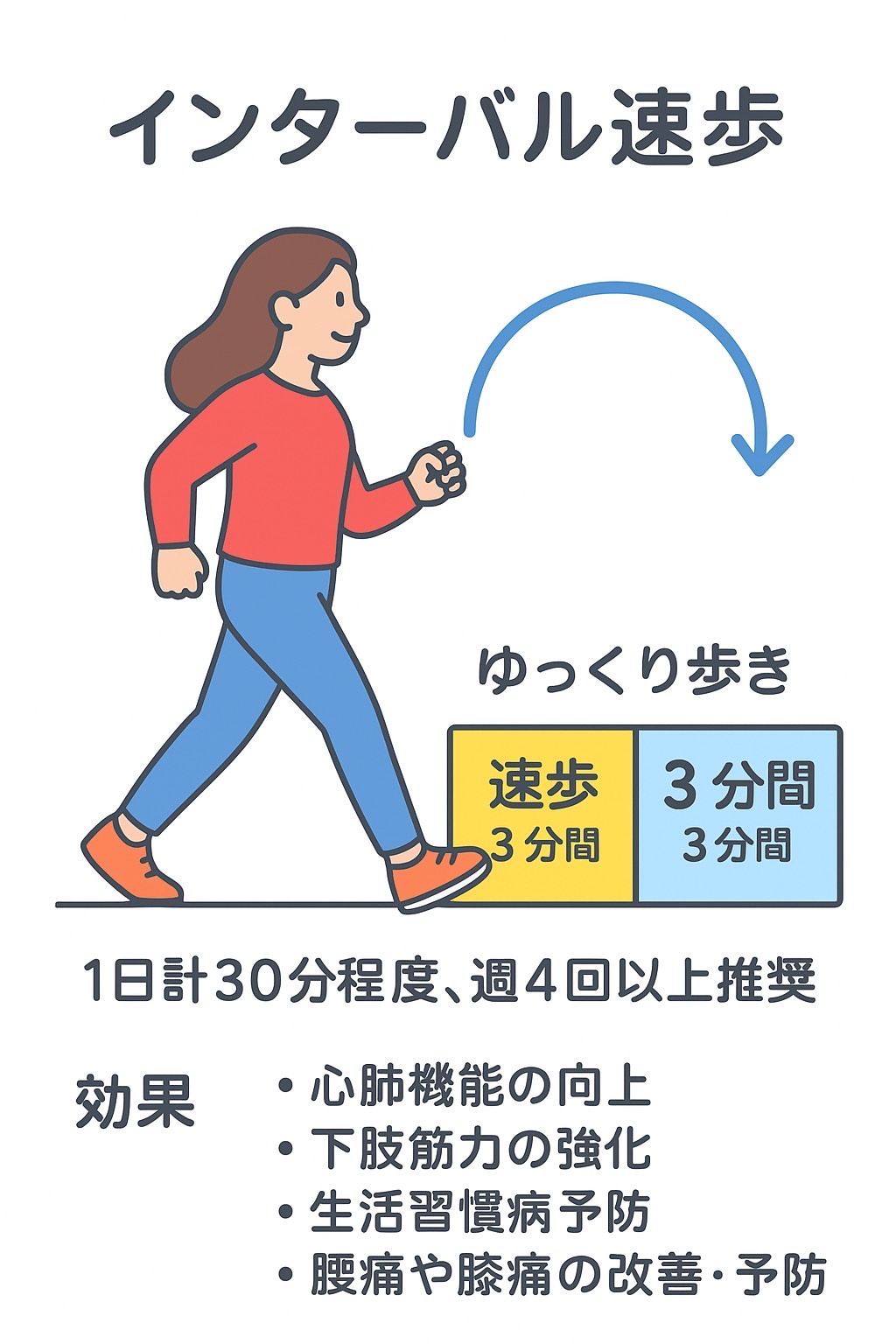理学療法の現場でも、インターバルウォーキングは中高年の方のリハビリや体力維持にとてもおすすめです。